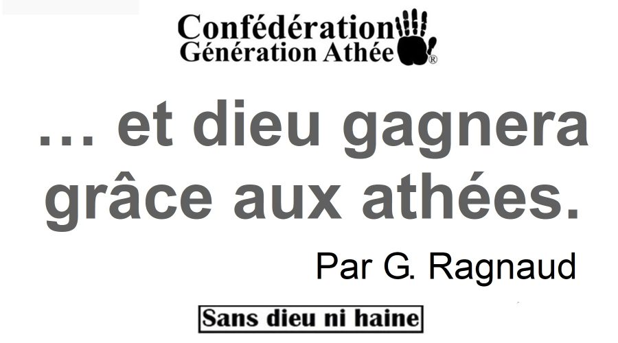 Partagez !      Le jeudi 3 octobre, G. Ragnaud, fondateur et porte-parole de Génération Athée, après avoir échangé avec l’avocat représentant de notre confédération, ainsi qu’avec les membres du nouveau bureau, a décidé que Génération Athée, selon ses moyens financiers, portera systématiquement plainte contre toutes formes de discriminations à l’encontre des athées …